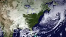 The 2011–12 winter opened with a nor'easter striking parts of the Mid-Atlantic and Northeastern United States in late October. The storm brought significant snowfall totals to much of the region, with some areas experiencing gale-force winds. Some areas between northeastern Pennsylvania and southern Maine received over 12 inches (30 cm) of snow, and parts of Massachusetts and New Hampshire received over 30 inches (76 cm) of snow. Many trees were downed because they had not yet lost their leaves, resulting in downed power lines and more than 3,000,000 residents losing power, some of whom remained without power for over a week following the storm. The storm ultimately resulted in one direct fatality and $18.8 million in damage.[6] Slightly over a week later, an intense extratropical cyclone—one of the strongest to strike the west coast of the state since 1974—brought high winds and flooding to Alaska. On November 8, a low initially crossed from the southern Aleutian Islands to near Gulf of Anadyr while intensifying. The low then weakened as it crossed the Chukchi Peninsula the following day. Gale-to-hurricane-force winds[7][8] combined with snow to create blizzard conditions across much of northern and western Alaska, and storm-induced flooding caused at least an estimated $24 million in damage. Some locations experienced water levels several feet above the normal.[9][8] One fatality was recorded before the storm's associated low entered the Chukchi Sea late on November 9, continuing to weaken as it moved off to the northwest and ceased to affect Alaska.[8] In late November, another storm affected the United States, bringing snow to the central Mississippi Valley. The storm ultimately dropped a few inches of snow across parts of Arkansas and Missouri in the central Mississippi River Valley before advancing into the Ohio Valley where it brought rain and snow to Lower Michigan and northern Indiana. Although the storm logged no casualties, it did cause thousands of dollars in flood damage to portions of Arkansas and Kentucky. Another system materialized in mid-December; it brought heavy snow, which in some cases combined with high winds to create blizzard conditions, to northeastern New Mexico and southeastern Colorado. Along the eastern end of the snow, precipitation transitioned to a wintry mix resulting in hazardous road conditions in central and south-central Kansas. The storm did not result in any known casualties, but it did cause over $50 thousand in damage in New Mexico.[6]