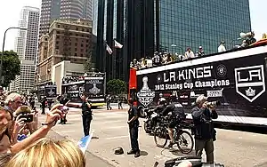 After clinching a postseason spot in their 81st game of the regular season,[1] the Kings became the first eighth-seeded team to win the Stanley Cup in NHL history (and the second eighth seed to reach the Cup Finals after the 2005–06 Edmonton Oilers). Their postseason began with an elimination of the Vancouver Canucks, who became the third Presidents' Trophy-winning team in the last four seasons to be eliminated in the opening round. Los Angeles went on to become the second team to eliminate the first, second, and third seeds from the playoffs in the same postseason after the 2003–04 Calgary Flames (and the first team to do so in that order).[2] In addition, the Kings became the first team to make the Finals undefeated on the road (with their 8–0 record).[3] As the sixth seed in their conference, the Devils were the lowest-seeded team to have home-ice advantage in the Stanley Cup Finals, breaking a record they set when they won the Cup as a fourth seed in 2000.