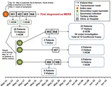 An outbreak of Middle East respiratory syndrome coronavirus occurred in South Korea from May 2015 to July 2015.[5] The virus, which causes Middle East respiratory syndrome (MERS), was a newly emerged betacoronavirus that was first identified in a patient from Saudi Arabia in April 2012. From the outbreak, a total of 186 cases were infected in the country, with a death toll of 38.[3]