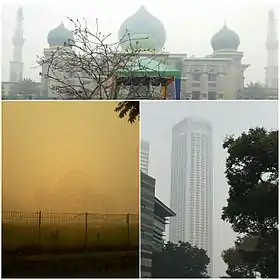 ![]() A collage showing various landmarks in the haze. Top: An-Nur Great Mosque, Pekanbaru, Indonesia Bottom-left: Darussalam Grand Mosque Palangkaraya, Indonesia Bottom-right: Swissôtel The Stamford, Singapore | |