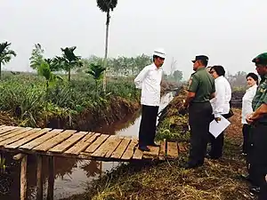 The Indonesian government also started building retention basins to restore moisture to the peatland in Sumatra and Kalimantan. Dry peatland, due to the dry season and also drainage for oil palm cultivation, was cited as the reason that fire spread quickly. Retention basins were built by blocking water flow in drainage canals, and the re-wetted peatland would serve to check the fire.[121][122]