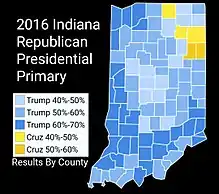 Trump won the state with 56.47% of the vote, while Clinton received 37.46%.[3] Indiana is the home state of Pence, which was believed to have provided important assistance to the Trump campaign in what already would have been a Republican-leaning state.