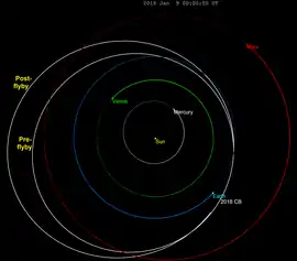 ![]() Highly elliptical orbit of 2018 CB, crossing those of both Mars and Earth. Positions shown for 1 January 2018, before flyby. | |