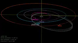 2020 LD is an Apollo near-Earth asteroid roughly 140 meters (460 feet) in diameter. It was discovered on 7 June 2020 when the asteroid was about 0.03 AU (4.5 million km; 12 LD) from Earth and had a solar elongation of 154 degrees. The glare of the Sun had masked the approach of the asteroid since November 2019.[3][lower-alpha 1] The asteroid passed closest approach to Earth on 5 June 2020 at a distance of 0.002 AU (300 thousand km; 0.78 LD).[2] The close approach distance is now known with an accuracy of roughly ± 1000 km. This is the largest asteroid to pass closer than the Moon this year and possibly the largest since (308635) 2005 YU55 in November 2011.[lower-alpha 2][lower-alpha 3] The asteroid makes close approaches to Mercury, Venus, Earth, and Mars.[2] It will be brighter than apparent magnitude 24 until 18 July 2020.