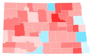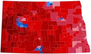 Trump won North Dakota 65.1% to 31.7%, a margin of 33.4%, about three points down from his 36-point victory in 2016. North Dakota, a rural state covered in the Midwestern Plains, is one of the most reliably Republican states in the nation. It last voted for a Democrat in 1964, when Lyndon B. Johnson carried it against the backdrop of his nationwide landslide victory. Since 1964, the Peace Garden State has been competitive in only three elections: 1976, 1996, and 2008. A few prime reasons why this state votes heavily for Republicans include its older, majority-White populace; agribusiness; and the state's recent oil boom. In recent presidential elections, Bakken shale oil has been a major driver of conservative success in the state, as the oil boom increasingly fuels the economy of North Dakota.[4] The main oil boom has taken place in the western counties—perhaps Trump's main base. Trump signed executive orders on his first month in office, reviving the Keystone and Dakota Access Pipelines rejected by the Obama administration.[5] Despite Biden's modest improvement over Hillary Clinton four years earlier, this remains the second-worst Democratic performance in the state since 1980.
