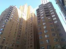 240 Central Park South occupies about half of its land lot.[13][23][24] The building is largely "C"-shaped in form and contains two primary sections, a 28-story section on Central Park South and a 15-story section on 58th Street, connected by the lobby running along Broadway.[13][23] Atop the main roofs of each apartment block are placed chimneys and water towers.[25][26][27] 240 Central Park South is variously quoted as having either 325,[23] 326,[26][27] or 327 apartments across its two apartment blocks.[28][lower-alpha 2]