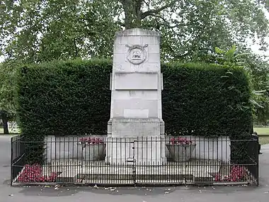 The battalion's own World War I memorial was unveiled at the entrance to Kennington Park in 1924, with an inscription to its World War II dead added later.[37][38][39]