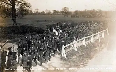 Under the Haldane Reforms of 1908 the Volunteers were subsumed into the new Territorial Force (TF), administered by county Territorial Associations.[22][23][24] The volunteers in rural Surrey came under the Surrey Territorial Association; however, because many of the North Surrey suburban parishes had been included in the new County of London since 1889, the battalions recruited in South London were included in a new all-TF London Regiment under the County of London TA. Consequently the 4th VB Queen's became 24th (County of London) Battalion, London Regiment (Queen's).[5][6][7][8][25][26][27][28]