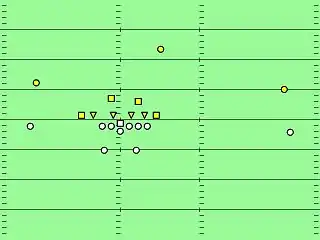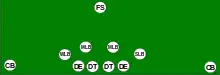 Four man fronts are seen in the 1940s as ad hoc ways to deal with the "Bears" T, as the result of two linemen dropping off from the 6-2 of the time into short zones, and later as a prepared defense for use against the spread offenses of the time.[1][3][4] In the 1950s, the six man line was no longer seen in the pros as a base defense, and the wide tackle six evolved to handle the interior attack of the Power T, and the outside threats of the Split T.[5][6] To deal with flankers and split ends, contain theories such as the "five spoke" contain were developed, where the defensive ends became much like outside linebackers and had pass defense responsibilities.[6][7] Homer Smith, in his history of 8 man lines, shows formations starting with the 1940s style 6-2, changing into the wide tackle six, and eventually, six man lines becoming 4 man lines as the defensive ends were relabeled outside linebackers.[5] This change is similar to the defensive ends of the 5-2 being relabeled the outside linebackers of the 3-4.