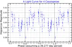 ![]() A light curve for 4 Cassiopeiae, plotted from Hipparcos data.[1] The assumed period is from Koen and Eyer (2002).[2] | |