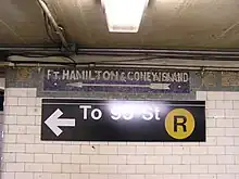 The station's main entrance has two staircases to each platform and one to each northern corner of Fourth Avenue and 53rd Street. The mezzanine allows transfer between directions and contains some original mosaic directional and arrow signs.[45][46] The one by the staircases to the southbound platform displays "Ft. Hamilton & Coney Island" while the one by the Manhattan-bound platform staircases displays "Down Town Trains."[47][48]