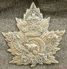 ![]() Cap badge of the 5th Battalion, Canadian Mounted Rifles | |
