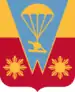 - Shield: Per fess enhanced Or and Gules, on a pile of two points Azure (Korean service ribbon Blue) fimbriated at the first between in base two Philippine suns of the like, a howitzer mounted on a heavy drop platform and attached to an open parachute all of the last.