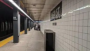 The 86th Street station is a local station on the IND Eighth Avenue Line of the New York City Subway. Located at Central Park West and 86th Street on the Upper West Side, it is served by the B on weekdays, the C train at all times except nights, and the A train during late nights only.