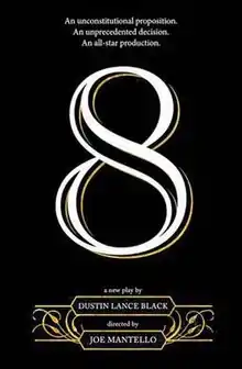 8 is an American play that portrays the closing arguments of Perry v. Schwarzenegger, a federal trial that led to the overturn of Proposition 8, an amendment banning same-sex marriages in California. It was created by Dustin Lance Black in light of the court's denial of a motion to release a video recording of the trial and to give the public a true account of what transpired in the courtroom.