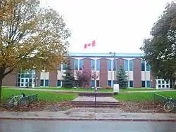 Robert D. Schoales, a noted regional modernist, was responsible for the design of the existing structure that would be built concurrently with Westminster Secondary School in Byron. As architect for the London Board of Education, Schoales was responsible for the design of many of London's mid-century school buildings, including Knollwood Park Public School (70 Gammage Street), G. A. Wheable Centre for Adult Education London (70 Jacqueline Street), and many others. His design incorporated an L-shaped two-story brick structure, including a stilted instrumental music wing, and auditorium. Terrazzo flooring was chosen for its durability, while glazed tile was utilised as an attractive, yet cost effective decoration for the entrance foyers. In addition to consultation work with educational boards throughout Ontario, Schoales collaborated with the Ministry of the Solicitor General, providing advice in the design and construction of correctional facilities across the province.[3]