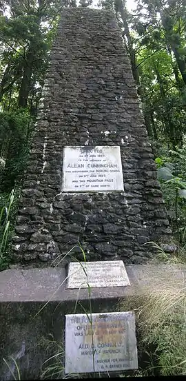 Cunningham returned to the Moreton Bay penal colony in 1828, setting off from Brisbane with Patrick Logan, Charles Fraser and five men to find Mount Warning and to establish the route to Cunningham's Gap which he did, on 24 July.[4] The peaks on either side of the gap were also named, Mount Cordeaux and Mount Mitchell. After exploring the McPherson Range area, Cunningham travelled on the south side of the Gap whereas the highway today runs further north, through the gap, from the small township of Aratula. Spicer's Gap which runs parallel to Cunningham's Gap was actually the pass first identified by Cunningham in 1827.[10] After its rediscovery in 1847, Spicer's Gap was used as a stagecoach route. In 1829, Cunningham explored the Brisbane River.