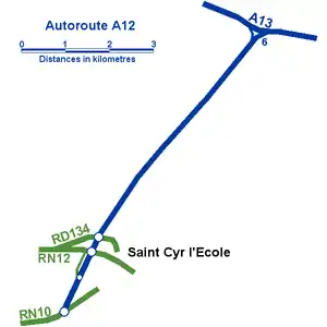 Autoroute A12, is a French autoroute located in Yvelines, near Paris. It branches off from A13 (also known as the Motorway of Normandy) at an exchange known as the Triangle de Rocquencourt located in the town of Bailly and merges with RN12 and RN10 at Bois-d'Arcy. Its total length is 8.5 km (5.3 mi). Access is free.