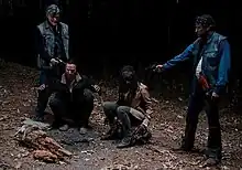 That night, they are ambushed by Joe and his gang of Claimers, whose number also includes the reluctant Daryl. Joe had been tracking Rick's group for some time, seeking revenge on Rick for killing one of his own. Joe holds Rick at gunpoint, and Daryl (who was unaware it was Rick's group being tracked) tries to convince Joe to not harm his friends. Joe refuses Daryl and has two of his men secure him before turning his attention back to Rick. Joe says that the Claimers are "reasonable men", but in revenge, he will have Daryl beaten to death, sexually assault Michonne, then Carl, and then kill Rick after he is forced to witness this. One Claimer, Dan, prepares to rape Carl. Instinctively, Rick headbutts Joe, who fires his gun but misses, but the shot leaves Rick temporarily deaf. Joe wrestles and secures Rick, but Rick then bites into Joe's carotid artery and rips out his jugular vein, killing him and shocking the other Claimers. Daryl and Michonne use the moment to break free of their captors, killing the rest of the Claimers except Dan. Dan pleads for his life, but Rick stabs him with Joe's pocketknife and disembowels him, and then continues to stab him to death repeatedly, as Carl watches. Rick makes sure the others are safe, and he and Daryl reconcile, and Daryl explains that he got separated from Beth and is unaware of her fate.