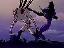 ![]() Eva-01 (right) tries to stop Jet Alone (left). The Jet Alone affair has been described by critics as a deconstruction of the mecha genre and a political satire. | |