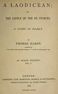 A Laodicean; or, The Castle of the De Stancys. A Story of To-Day is a novel by Thomas Hardy, first published in 1880–81 in Harper's New Monthly Magazine. The plot exhibits devices uncommon in Hardy's other fiction, such as falsified telegrams and faked photographs.