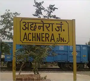 Achhnera Junction railway station (station code AH) is a railway station located in Agra district in the Indian state of Uttar Pradesh.[1][2][3] It has an average elevation of 167 metres (547 feet). It is reachable through Agra Jaipur Highway. The city is connected by rail to Agra, Jaipur, Kanpur and Mathura.[4]
