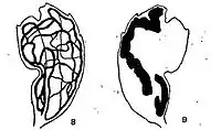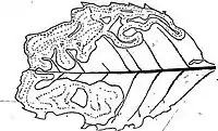 The larvae feed on Pseudopanax arboreus and Raukaua simplex.[2] They mine the leaves of their host plant. The mine is entirely on the under-surface of the leaf. Throughout its whole course it is a simple gallery, and very tortuous in its direction. The chief direction is in the long axis of the leaf, and the outer portions of the leaf are more mined than the centre. The gallery twists and turns, and in its course follows so close against the earlier portions that the partition between them is broken down, and finally the entire mine appears to form a huge blotch occupying about one half the leaf-surface. Though thus closely following its former track, it rarely crosses it except under direct need. The midrib forms a barrier, except in its upper and thinner part, where it is invariably crossed. The colour in the early stages of the mine is white with a fine brown central line occupied by the frass. The remainder of the mine is a shade paler green than the rest of the leaf.