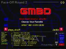 Once one player reaches 30 points, the top two players at this point are chosen to face-off. In the face-off rounds, the two players enter their acronyms and everyone else votes not knowing which acronym is from which player. Each face-off round lasts about 20 seconds and consists of: