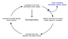 Cardiac traumas such as myocardial infarction (commonly called a heart attack), myocarditis, peripartum cardiomyopathy, cardiogenic shock , and takotsubo cardiomyopathy result in an impaired ability of the heart to pump blood. Without proper blood flow the person will ultimately die. Maintaining sufficient cardiac output is the primary objective of therapeutic approaches treating these cardiac conditions. However, many therapies aimed at increasing cardiac output place further stress on the heart. In this way a well-document vicious cycle begins in which increased cardiac output is required, but in order to achieve this the heart must work harder. This exacerbated stress leads to poorer outcomes.[1] With the exception of cardiopulmonary bypass, current therapeutic approaches do not allow the heart to rest and recover. The workload of the heart (pumping blood) is never uncoupled from heart function. Acute cardiac unloading is able to functionally uncouple[2] the heart from cardiac output, allowing the heart to rest and recover from damage.