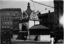 Scollay Square and Adams Square had similar baroque granite headhouses with four-sided clock towers designed by Charles Brigham. A small exit structure was located to the north, while the Brattle Loop used a separate entrance built into a building at Court Street and Brattle Street.[3] The headhouses of the Tremont Street subway were sharply criticized as "pretentiously monumental", with the Scollay Square headhouse compared to "an enlarged soda fountain".[4][5] Later stations on the East Boston Tunnel and Washington Street tunnel incorporated this criticism into their more modest headhouses.[4] In 1931, the headhouse was removed to improve visibility for automobile drivers and was replaced by a significantly smaller structure of modern design.[6][7] (Large headhouses at Scollay Square and Harvard were also torn down for similar reasons in that era.)[8]: 32 [9]