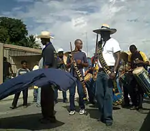 The Parranda de San Pedro is a religious festivity of Saint Peter that is celebrated every June 29 in the cities of Guatire and Guarenas in Miranda State, Venezuela. It has its origin in slaves community of the Colonial Era. It consists of some revelers, dressed in tail coat and topper (one of them carries the image of the saint, another carries a yellow and red flag) accompanied by Cuatro and Maracas. The percussion is achieved with some pieces of leather tied to the feet as sandals (called quotes). They are also accompanied by two prepubescent children, dressed in a red and yellow costume (similar to harlequins), who are known as "tucusitos". The most striking character is a man dressed as a woman carrying a rag doll.
