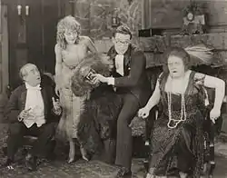 Still (right to left) of Herring with Harold Lloyd, Mildred Davis, and James T. Kelley in Among Those Present, 1921