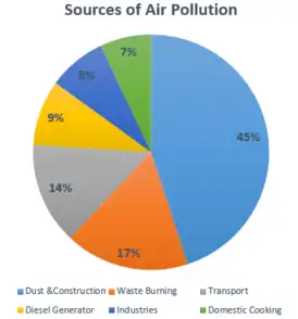 Air pollution in India is a serious environmental issue.[1] Of the 30 most polluted cities in the world, 21 were in India in 2019.[2][3] As per a study based on 2016 data, at least 140 million people in India breathe air that is 10 times or more over the WHO safe limit[4] and 13 of the world's 20 cities with the highest annual levels of air pollution are in India.[5] 51% of the pollution is caused by industrial pollution, 27% by vehicles, 17% by crop burning and 5% by other sources.[6] Air pollution contributes to the premature deaths of 2 million Indians every year. Emissions come from vehicles and industry, whereas in rural areas, much of the pollution stems from biomass burning for cooking and keeping warm. In autumn and spring months, large scale crop residue burning in agriculture fields – a cheaper alternative to mechanical tilling – is a major source of smoke, smog and particulate pollution.[7][8][9] India has a low per capita emissions of greenhouse gases but the country as a whole is the third largest greenhouse gas producer after China and the United States.[10] A 2013 study on non-smokers has found that Indians have 30% weaker lung function than Europeans.[11]
