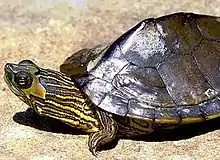 The Alabama map turtle (Graptemys pulchra) is a species of emydid turtle endemic to the southern United States. Differentiation from other turtle species includes a black stripe running down the center of its back with knobs extruding from it, but these projections wear down with age. T.H. Bean and L. Kumlen first collected the Alabama map turtle in July 1876 from a lake near Montgomery, Alabama. Type locality for this species is Montgomery County, Alabama. Baur described and named the Alabama map turtle in 1893. The genus Graptemys includes nine species of mostly aquatic turtles.[5]