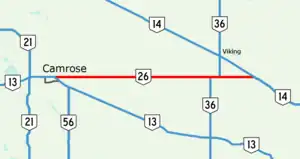 Highway 26 begins in the eastern outskirts of Camrose where it splits due east from Highway 13, which bends southeast toward Ohaton.[2] Highway 26 proceeds east along the 12th Correction Line,[2][3] first meeting Highway 834 at a T-intersection; Highway 834 becomes Highway 56 when it meets Highway 13. Highways 26 and 834 are concurrent for 5 km (3.1 mi) before Highway 834 branches off north to Round Hill. Highway 26 continues east, intersecting Highways 854, 855 and 857. Highway 26 meets Highway 36 approximately 12 km (7 mi) southwest of Viking and the two highways run concurrently for 3 km (2 mi) before Highway 36 turns north into Viking. After leaving Highway 36, the highway continues east to its end at Highway 14, approximately 4 km (2 mi) west of Kinsella.[2][4]