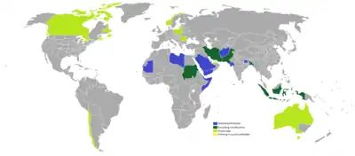 Some majority-Muslim countries, such as Saudi Arabia, Kuwait, Pakistan, Iran, Somalia, Libya, Yemen, etc. prohibit the production, sale, and consumption of alcoholic beverages either entirely or for its Muslim citizens because they are considered haram (forbidden) in Islam.[10][11][12] Alcohol was illegal in Sudan but, it was legalized for non-Muslims in July 2020. Other Muslim countries have it either illegal in certain parts or by non-Muslims.[13]