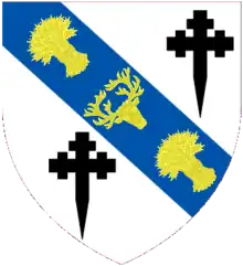 | Blazon | Argent on a bend Azure between two cross crosslets fitchy Sable a stag's head caboshed between two garbs Or. |