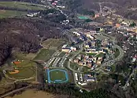 Aerial view of Alfred State taken in April 2006. Alfred University is shown in the upper right and Alfred, New York appears to the right