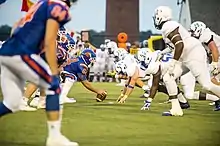 The Pioneers football team (right) lines up on defense during a 2017 game against the Coast Guard Bears