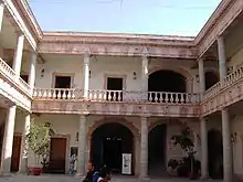 It measures 72 by 68 metres, with a height of 23 metres, and occupies an area of 4,828 square metres. It is constructed on the side of a hill and two of its sides are surrounded by elevations.[4] There are no ornamental facets on the exterior, except for a few windows at the top of each storage room.[5] It has cornices built in a Doric style, constructed with two types of regional stone—reddish and greenish. This gives it a curious appearance, resembling a stronghold or a castle, which it has come to be called by the people of Guanajuato. In the interior, there is a porch that leads to a spacious central patio. The porch contains Tuscan columns and adornments. There are two staircases that lead to the upper floor. The Grain Exchange building has only two access doors, a small one facing the east, adorned by two columns, and a large door of the same basic style, facing the north. The edifice was used for the buying and selling of wheat, corn, and other grains.[6] Prior to the Mexican independence from Spain, it was used as a warehouse, military barracks, and prison. Currently it serves as a regional museum.[5]