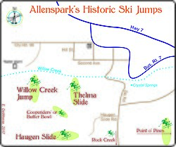 Skiing was popular in the Allenspark area in the 1920s and 1930s, when international ski jumping competitions were held. Jumps and ski courses included the Willow Creek Slide, Thelma Slide, Butter Bowl, Haugen Slide, and Point-O-Pines. The Rock Creek Ski area was developed after World War II and operated until 1952. Cross-country skiing is still popular, especially on Rock Creek and in Wild Basin.[13]