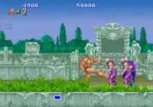 One of Uchida's goals was to create flashy visuals that would surprise players, so he asked his lead artist to focus just on the player character's transformation sequences for one month. Additionally, he and his team used the System 16 arcade system board for its ability to add great detail to large character sprites, as well as the visual effects it could provide, such as limbs flying off characters during combat.[7] Uchida was not impressed by the initial concept art, so he worked with an artist to sketch out his specific ideas on character design. While the results of this were positive, Uchida's lead designer quit the team over this situation.[10] Altered Beast includes Easter eggs that are references to other System 16 titles Alex Kidd: The Lost Stars and Shinobi, as a nod to members on Uchida's team that had worked on those titles previously.[7]