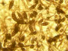 Teleomorph of Alternaria alternata is thought to be Clathrospora diplospora: this has yet to be confirmed.[7] If this is correct, as a result this pathogen would be propagating itself via asexual spores called conidia.[8] These conidia are produced in lesions on mature or dying leaves.[8] Their production can begin in as few as ten days after the first symptoms appear, and can continue for to up to fifty days.[9] A. alternata's conidia disperse via air currents, and their release from the lesions can be triggered by rainfall, or even just a sudden drop in humidity.[9] When the conidium lands on a leaf, it will wait until the nighttime dew, and then germinate.[8] It can either enter through the stomata, or penetrate directly through the top of the leaf, using its appressorium, infecting the leaf within 12 hours.[8]