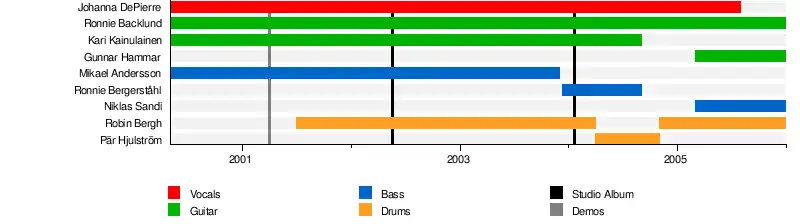 The initial members on 1 May 2000 were Johanna de Pierre (vocals), Kari Kainulainen (guitar), Ronnie Backlund (guitar), and Mikael Andersson (bass). They released the early demo. Robin Bergh (drums) joined on 1 July 2001. They released a studio album on 20 May 2002. Mikael Andersson (bass) left on 1 December 2003, and gets replaced by Ronnie Bergerståhl. On 20 January 2004, they released another studio album. Robin Bergh (drums) left on 1 April, getting replaced by Pär Hjulström the same day. Kari Kainulainen (guitar) left on 1 September. Ronnie Bergerståhl (bass) left the same day. Pär Hjulström (drums) left on 1 November, getting replaced by Robin Bergh the same day. Gunnar Hammar (guitar) joined on 1 March 2005. Niklas Sandi (bass) joined the same day. The timeline ended on 1 August 2005.