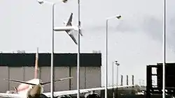 ![]() Flight 191 after takeoff, missing its left engine, leaking fuel and hydraulic fluid | |