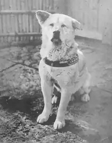The story of Hachikō, the most revered Akita of all time, helped push the Akita into the international dog world. Hachikō was born in 1923 and owned by Professor Hidesaburō Ueno of Tokyo.[31] Professor Ueno lived near the Shibuya Train Station in a suburb of the city, and commuted to work every day on the train.[19] Hachikō accompanied his master to and from the station each day.[19] On May 25, 1925, when the dog was 18 months old, he waited for his master's arrival on the four o'clock train, but Professor Ueno had suffered a fatal brain haemorrhage at work.[19] Hachikō continued to wait for his master's return.[19] He travelled to and from the station each day for the next nine years.[19] He allowed the professor's relatives to care for him, but he never gave up the vigil at the station for his master.[19] His vigil became world-renowned when, in 1934,[32] shortly before his death, a bronze statue was erected at the Shibuya train station in his honor.[19] This statue was melted down for munitions during the war, but a new one was commissioned after the war.[32] Each year on March 8 since 1936, Hachikō's devotion has been honoured with a solemn ceremony of remembrance at Tokyo's Shibuya railroad station.[33][34] Eventually, Hachikō's legendary faithfulness became a national symbol of loyalty, particularly to the person and institution of the Emperor.[35]
