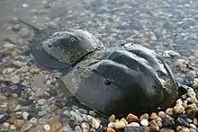 Amplexus occurs in all four species of horseshoe crab. Horseshoe crabs typically go ashore for amplexus in high tide, and end up on beaches where the eggs are more protected.[16] The first pair of walking legs is used to tightly clasp the female in all species, and the second pair is also employed in all but Limulus polyphemus.[17] A male horseshoe crab develops modified claspers during sexual maturity when the male moults; these modified claspers can then help during the process of amplexus.[18] The male's pair of posterior claspers are known for having the ability to maintain long-term amplexus which have been found to always attach to the female's opisthosoma during amplexus.[18] In contrast, the male's anterior claspers have been found to attach to the female's opisthosoma as well, but on the lateral edges of the opisthosoma and function to resist displacement from environmental factors.[18] Uniquely, amplexus is most likely to occur between horseshoe crabs when the female horseshoe crab has a hard shell.[18] Additionally, males who inhabit a clean shell are more likely to enter amplexus, compared to males who contain a dirty shell, as it seems that females have a preference for clean shells on males.[18] A male horseshoe crab's claspers may also be an important factor of consideration for the initiation of amplexus. Since claspers are used for the attachment to the female, claspers that are in good condition are more successful for the initiation of amplexus.[19] If a male horseshoe crab has a damaged or missing clasper, then that puts the male at a disadvantage and increases the probability of being displaced by other competing male crabs.[19]