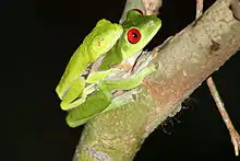 The competition for a female mate among males is considered intense, and it is not uncommon for a male amphibian to attack an already-amplexed pair of amphibians.[3] When a male amphibian attacks an amplexed pair of amphibians, he is trying to force the other male to release its grasp of the female, so he can then mate with her.[3] Male amphibians are also known to show mate-guarding behaviour, which is shown after amplexus, and it is the male's attempt to prevent the female amphibian from mating with other males.[3]