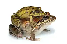 Amplexus (Latin "embrace") is a type of mating behavior exhibited by some externally fertilizing species (chiefly amphibians and horseshoe crabs) in which a male grasps a female with his front legs as part of the mating process, and at the same time or with some time delay, he fertilizes the eggs, as they are released from the female's body.[1] In amphibians, females may be grasped by the head, waist, or armpits, and the type of amplexus is characteristic of some taxonomic groups.
