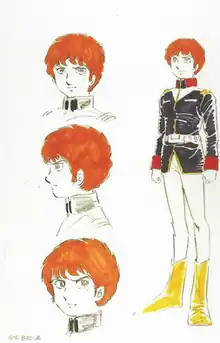 Tomino gave the Gundam main character the name Amuro believing such word did not exist. However, three months after the show aired, Tomino received a letter from Sunrise informing him there was an island named Amuro in Okinawa.[32] Amuro was introduced as an ordinary man in contrast to his rival Char Aznable. As a result, he found Amuro hard to write as he was meant to oppose Char whom Tomino found more interesting.[33] In one scene of an early episode, Amuro is slapped by Bright as a method of correction. Tomino considered this scene vital as he found this type of violence needed for a young person to mature most notably due to the way Amuro was misbehaving.[34] Shin Sasaki from Sunrise considers the final scene from the Mobile Suit Gundam film trilogy where Amuro returns to White Base as one of the most memorable ones from the entire franchise. Meanwhile, Amuro has a close relationship with Fraw Bow ever since childhood and remain friendly in the White Base. Yasuhiko had problems with Tomino's commentary about how these two characters do not end in a relationship. Instead, there is no further appeal between their relationship in Zeta Gundam where Amuro instead becomes more attracted to Sayla Mass, possibly due to her being his type of woman according to the staff.[35] Amuro was announced by Tomino as a new type of being as reflected in how society needs this new type of human being. Tomino considered Amuro "kind of simple for the potential that human beings can reach in the future."[36] Character designer Yoshikazu Yasuhiko stated that Amuro's misrelationship with the members of the crew of the White Base and his mother were outstanding by the time the series premiered in contrast to previous conventional heroes who would make up with each other.[37]